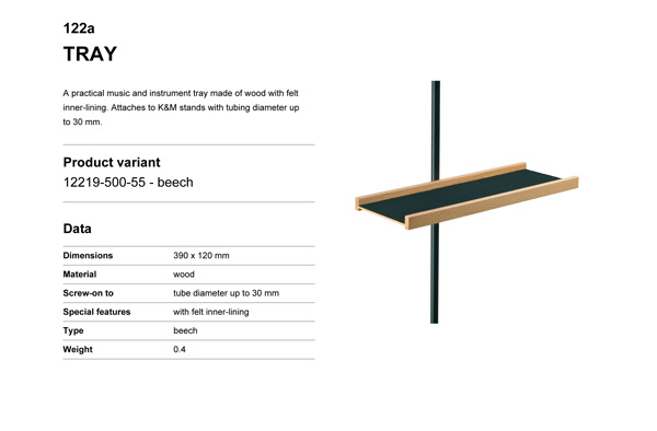 A practical music and instrument tray made of wood with felt inner-lining. Attaches to K&M; stands with tubing diameter up to 23 mm.