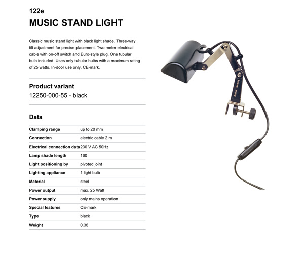 Classic music stand light with black light shade. Three-way tilt adjustment for precise placement. Two meter electrical cable with on-off switch and Euro-style plug. One tubular bulb included. Uses only tubular bulbs with a maximum rating of 25 watts. In-door use only. CE-mark.