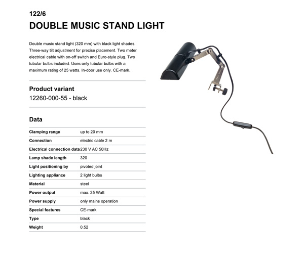 Double music stand light (320 mm) with black light shades. Three-way tilt adjustment for precise placement. Two meter electrical cable with on-off switch and Euro-style plug. Two tubular bulbs included. Uses only tubular bulbs with a maximum rating of 25 watts. In-door use only. CE-mark.