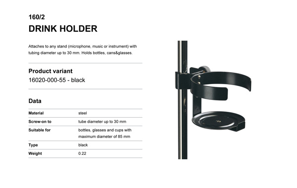 Attaches to any stand (microphone, music or instrument) with tubing diameter up to 23 mm. Holds bottles, cans & glasses.