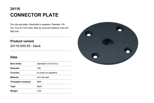 Zinc die-cast plate. Attachable to speakers. Diameter 105 mm. Four 6.5 mm holes. May be used with distance rods with M20 bolt.