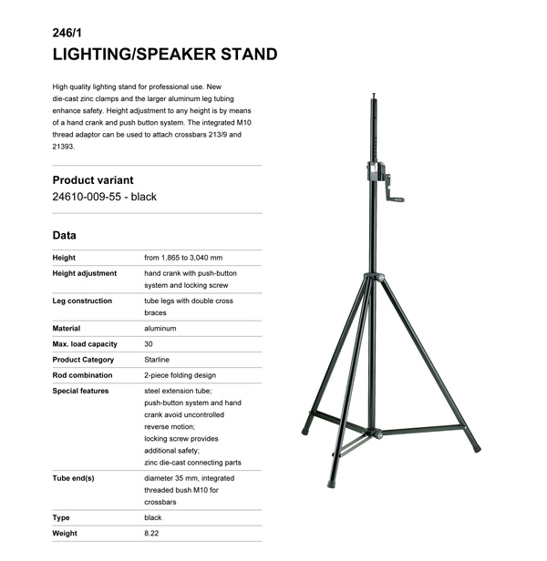 GS-approved for loads up to 30 kg (only as speaker stand). Wt: 8.3 kg, H: 1865/3040 mm.