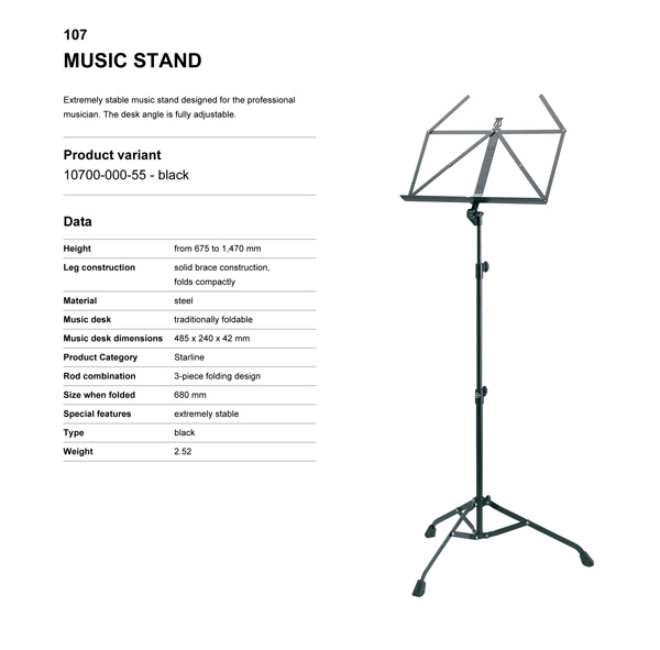 Extremely stable music stand designed for the professional musician. The desk angle is fully adjustable.
