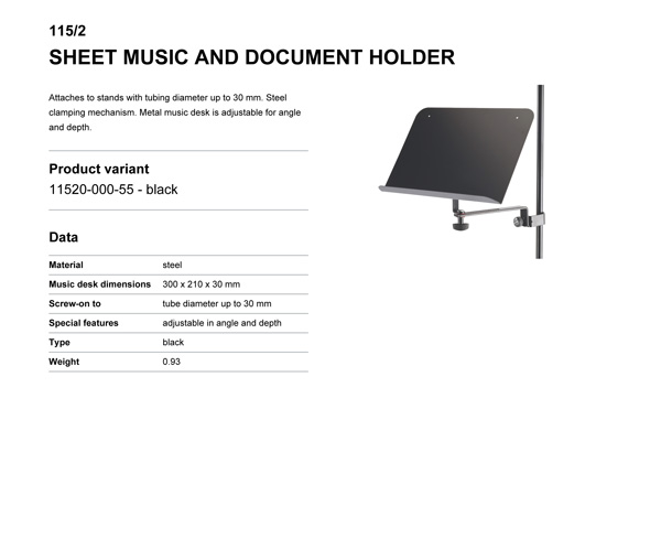 Attaches to stands with tubing diameter up to 23 mm. Steel clamping mechanism. Metal music desk is adjustable for angle and depth.
