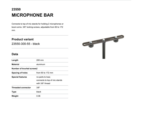 Connects to top of mic stands for holding 2 microphones or boom arms. 3/8" locking screws, adjustable from 60 to 172 mm.