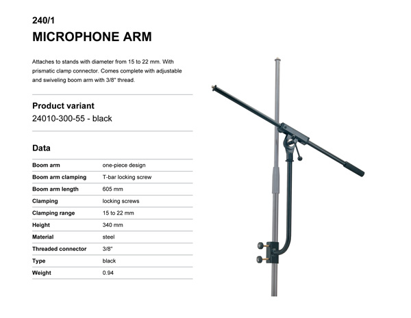 Attaches to stands with diameter from 15 to 22 mm. With prismatic clamp connector. Comes complete with adjustable and swiveling boom arm with 3/8" thread.